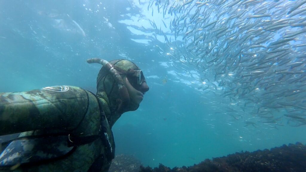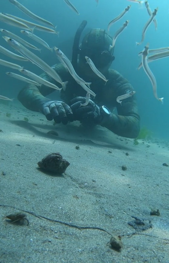 Pe măsură ce mă apropii de fundul mării, primele siluete de pești își fac apariția. Bancurile de chefali sunt fascinante. Înoată împreună ca un singur organism, o simfonie perfect sincronizată. Mă opresc pentru câteva momente, păstrând o distanță respectuoasă, iar în acel moment îmi dau seama că nu sunt doar un simplu observator. Sunt parte din acest peisaj viu, un musafir care, pentru câteva clipe, împărtășește aceeași lume cu aceste creaturi incredibile.